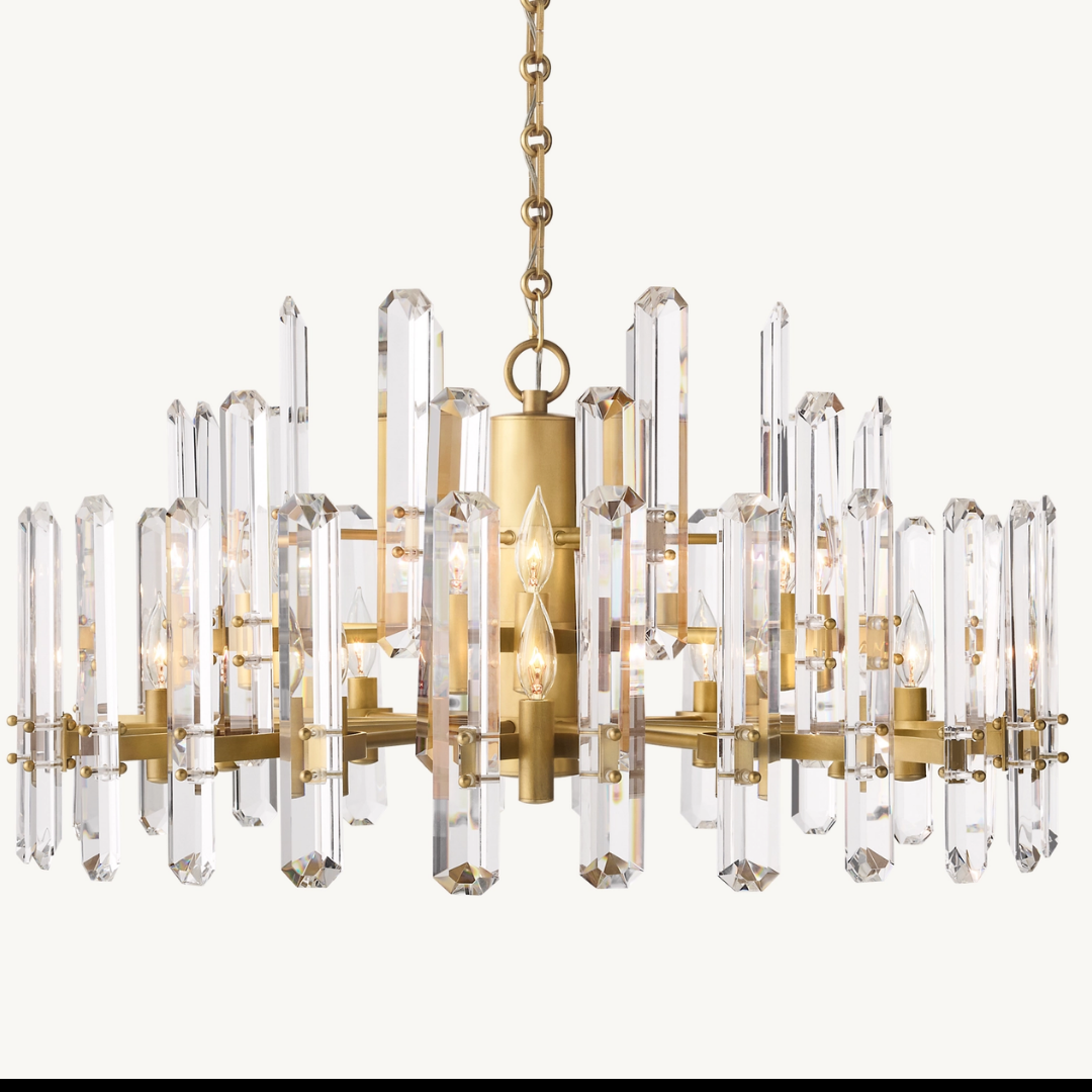 An ornate 72’’ brass and crystal chandelier that combines grandeur with modern elegance. Its halo-inspired design and sparkling crystal accents make it the perfect centerpiece for high-end interiors, offering timeless luxury and radiant brilliance.